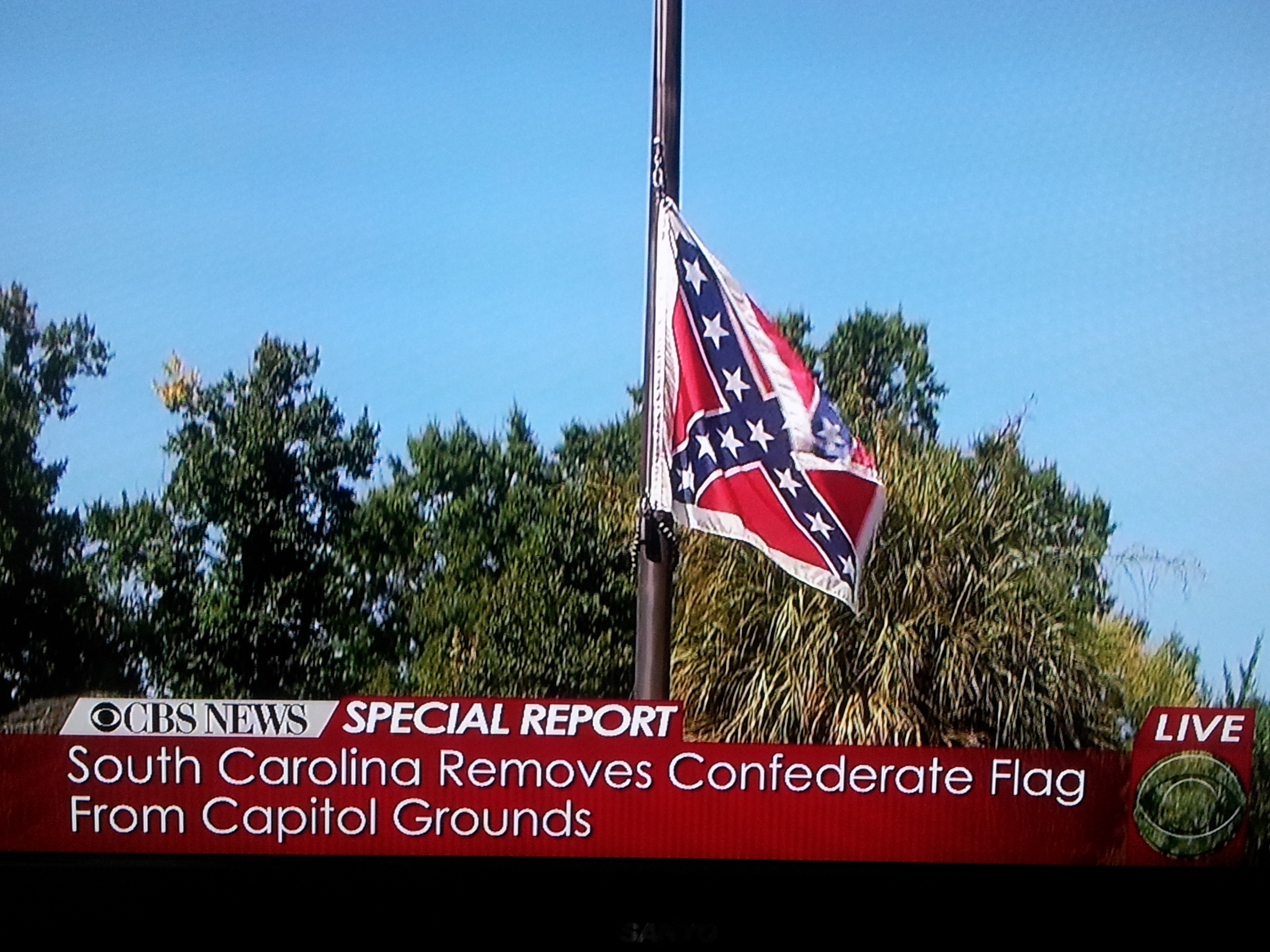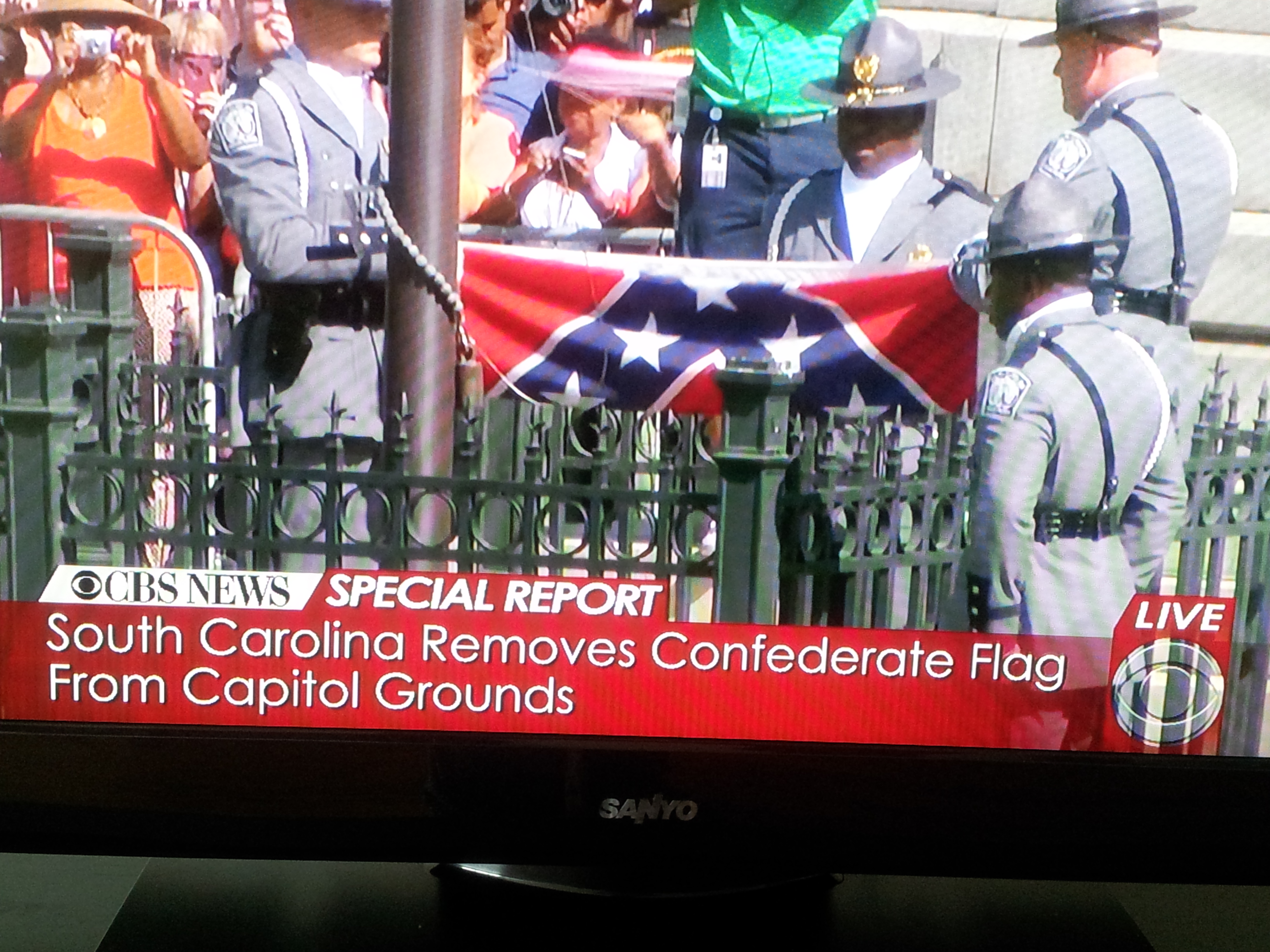 I did not see the ceremony to retire the Confederate battle flag from the South Carolina State House grounds. I happened to have a doctor’s appointment at that time. My wife snapped the photos you’ll see in this space from the live TV coverage.